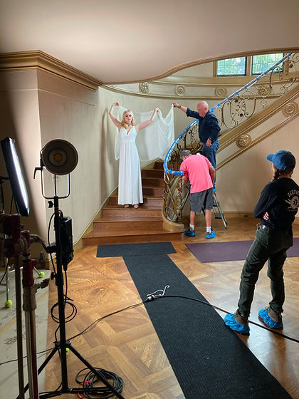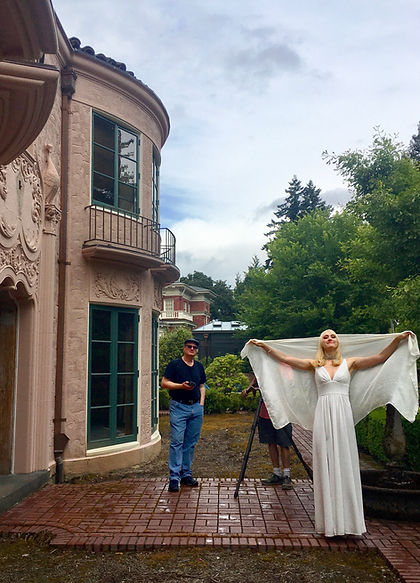 I decided to go with a lot of “plates” where we took long lock off shots of an empty section, then let the actress move in and out of the space where she could be translucently blended into the plated image. This worked really well in the hallway peek-a-boo sequence, for instance. For the staircase, fairly similar: pick a variety of matching shots, lock them off, and then let Director Brent Heise work his movie magic as he effects edited the film in post. You’d never know how rough the staircase looked in the raw video. Pretty amazing skill! The gaffer and I tried hard to light the actress and her billowy white gown as softly as possible when she was in apparition mode, which made it easier to ghost her in and out of reality. Once she and the main character had their real time dance encounter, then it was a harder edged “spotlight” look to bring her more sharply to life and bump up the dramatic feel of attainment and then loss. One of my favorite shots was totally serendipitous. As we were under a porch overhang waiting out the afternoon rain to shoot the garden levitation sequence (hello…Oregon), a shaft of sunlight suddenly popped out and backlit the actress through the gently falling mist. I had her take two steps back into the light and gaze sorrowfully into the camera. The sunlight lasted less than 30seconds and then it was gone. That’s the kind of unplanned lagniappe that keeps you energized on a long shoot day.
