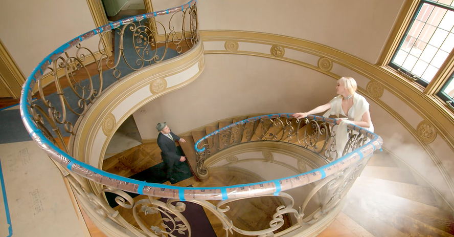 There were a couple of major challenges. We had to create an unworldly, “now she’s there, now she isn’t” look across many different locations and set ups. However, the historic mansion location was being renovated, which meant there were all sorts of bogeys lurking in the background like scaffolding and tools and boxes. Even worse, on the main grand staircase the wooden railing was completely covered in bright blue protective padding!